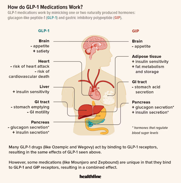 Glucagon-Like Peptide-1 is a hormone in our body that regulates blood sugar and appetite, and the GLP-1 medications mimic this hormone, causing us to feel full with less food, avoid spikes in our blood sugar, and quiet the “food noise” that often causes us to eat even when we aren’t physically in need of food.